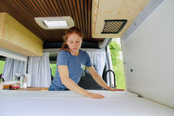 ![]() Large Living Area Tonnes of Storage | ![]() Roof window for ventilation and light | ![]() Bed flips easily into comfy lounge area |